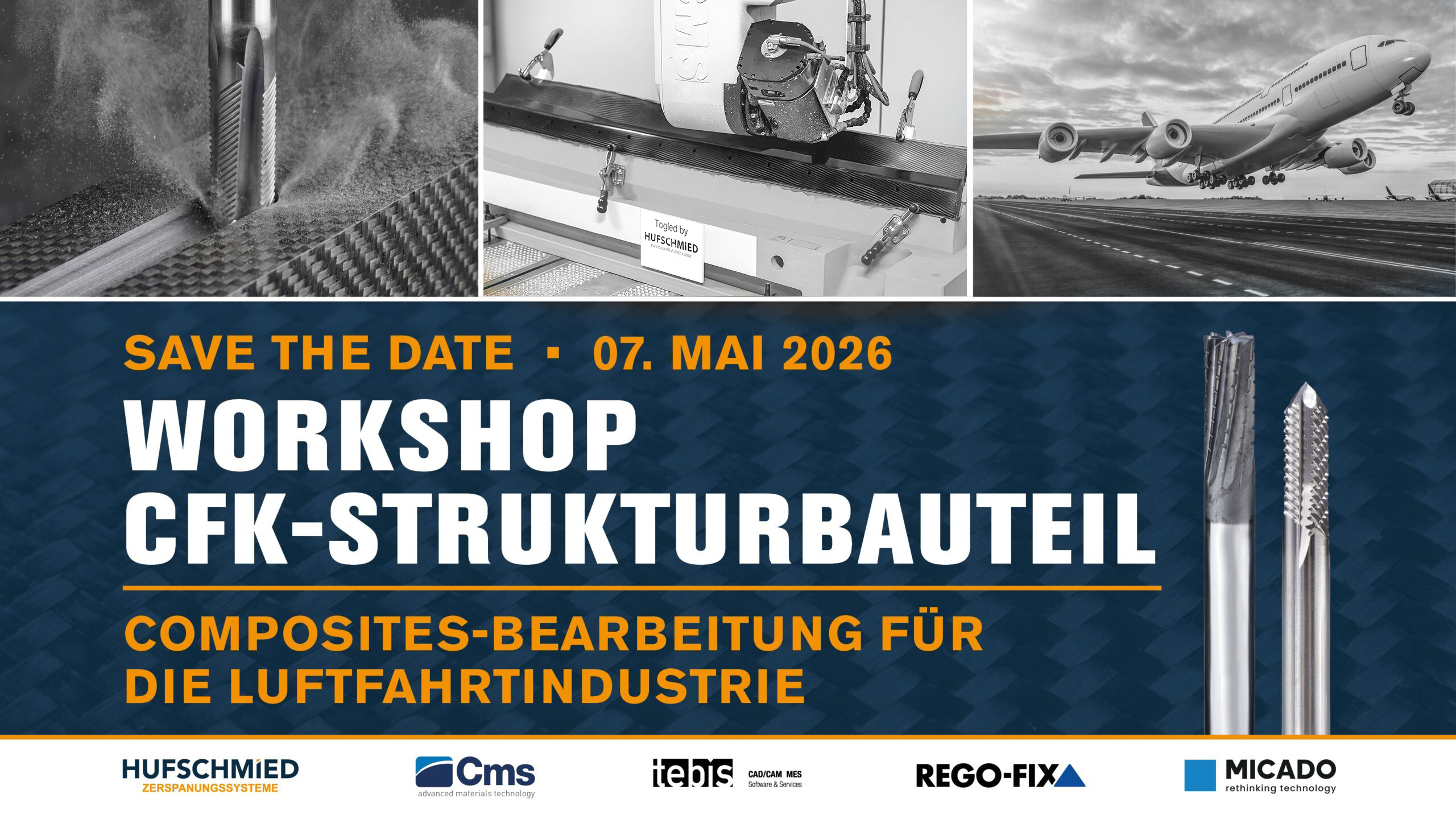 Die Bearbeitung von CFK-Strukturbauteilen stellt höchste Anforderungen an Prozesssicherheit, Bauteilqualität und Wirtschaftlichkeit. In der Praxis zeigt sich jedoch häufig: Entscheidend ist nicht die einzelne Komponente, sondern das Zusammenspiel der gesamten Prozesskette. Genau hier setzt unser Workshop an. Gemeinsam mit führenden Technologiepartnern präsentieren wir eine durchgängige, real abgestimmte Prozesskette der CFK-Zerspanung – von der NC-Programmierung über Maschinenstrategie und Spanntechnik bis hin zur Werkzeugauswahl und optimalen Prozessparametern.