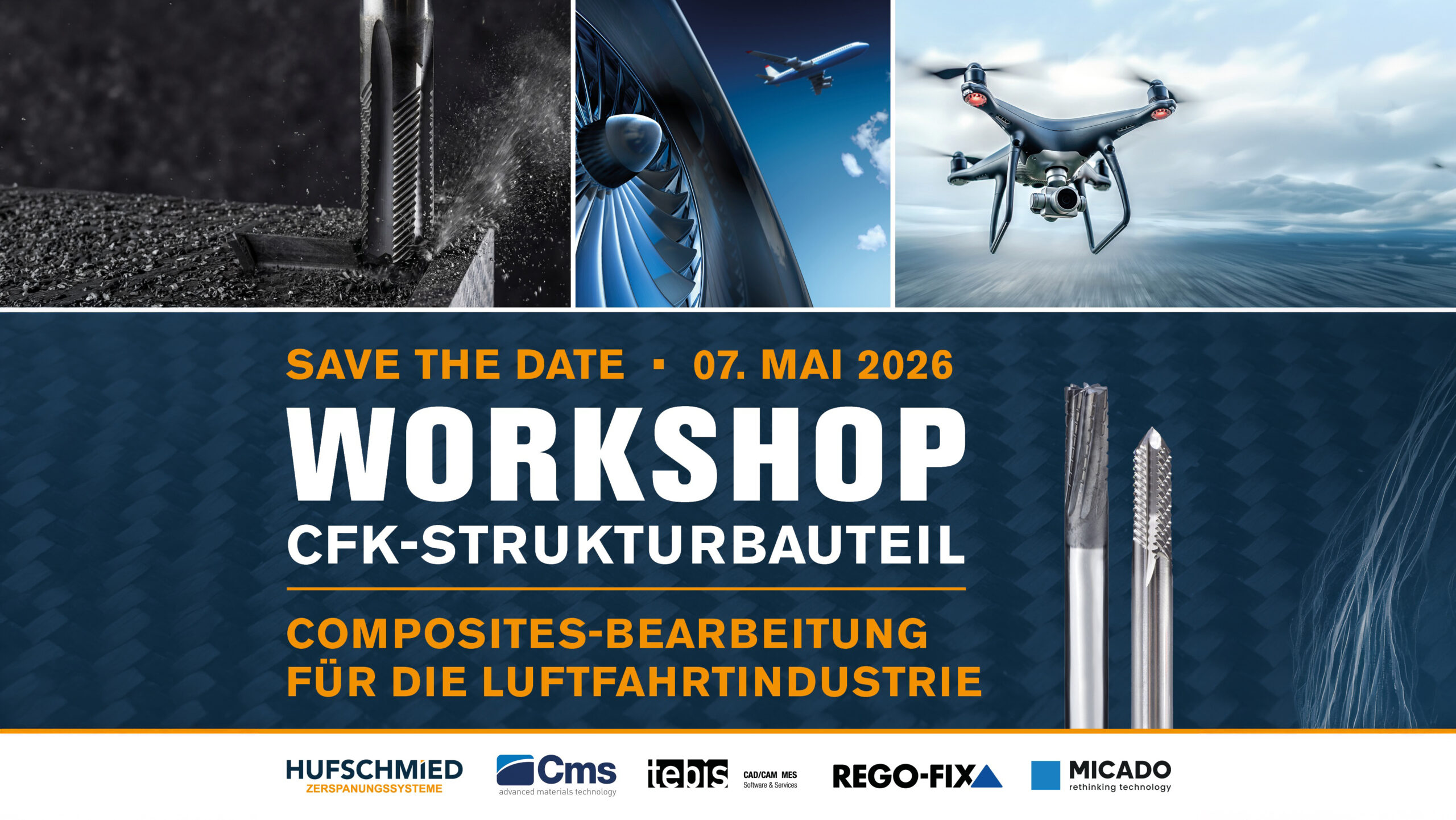 Am 07. Mai 2026 lädt Hufschmied Zerspanungssysteme zum Anwender-Workshop „CFK-Strukturbauteil“ nach Bobingen ein. Gemeinsam mit führenden Technologiepartnern wird eine durchgängige Prozesskette der CFK-Zerspanung praxisnah dargestellt – vom CAD/CAM-Datensatz über Maschine, Spanntechnik und Werkzeug bis zur fertig bearbeiteten Bauteilkante. Im Fokus stehen Prozesssicherheit und wirtschaftliches Fertigen in der Luftfahrtindustrie, demonstriert an einem realen CFK-Strukturbauteil.