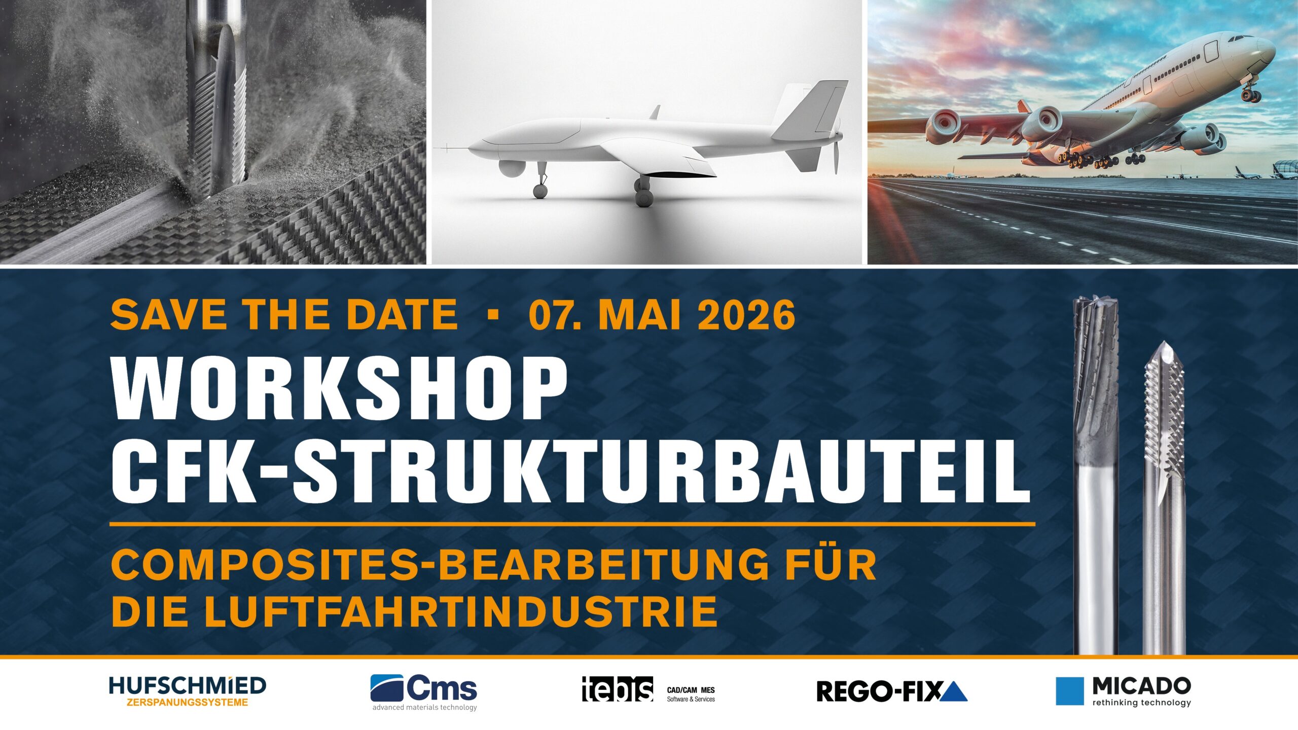 Am 07. Mai 2026 lädt Hufschmied Zerspanungssysteme zum Anwender-Workshop „CFK-Strukturbauteil“ nach Bobingen ein. Gemeinsam mit führenden Technologiepartnern wird eine durchgängige Prozesskette der CFK-Zerspanung praxisnah dargestellt – vom CAD/CAM-Datensatz über Maschine, Spanntechnik und Werkzeug bis zur fertig bearbeiteten Bauteilkante. Im Fokus stehen Prozesssicherheit und wirtschaftliches Fertigen in der Luftfahrtindustrie, demonstriert an einem realen CFK-Strukturbauteil.